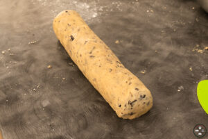 - Farinez votre table et formez un boudin avec votre pâte. Enfermez le dans du papier film et laissez le au congélateur. Une nuit ou au moins 1h30